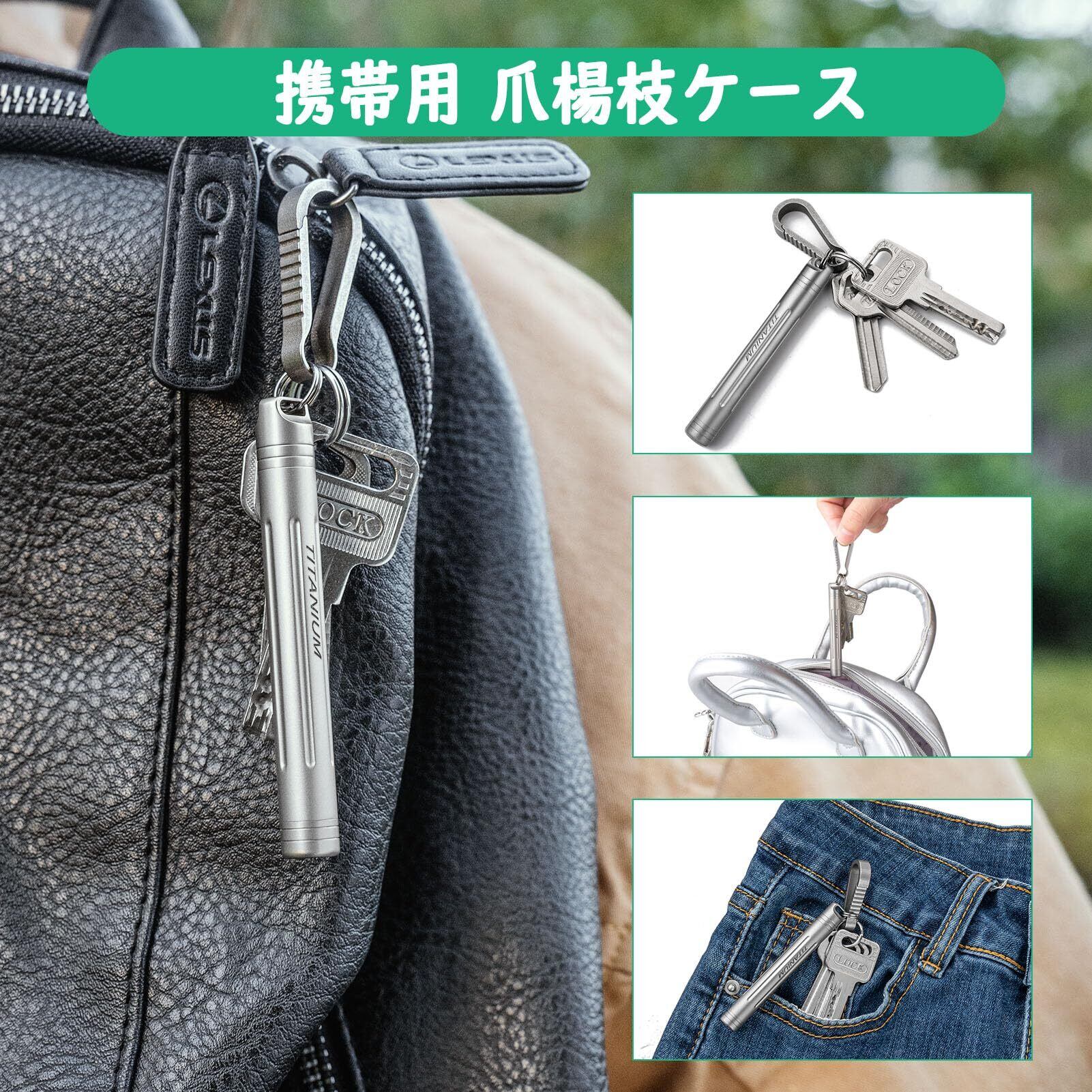 包装内容:チタン 爪楊枝入れ*1個 + チタン爪楊枝*1個 +ステンレススチール製のキーリング*1個