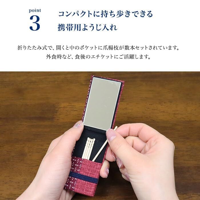 食後のエチケットに、コンパクトに携帯できる楊枝入れです。 楊枝を入れる上部には鏡が付いているので、サッと口内チェックができます。