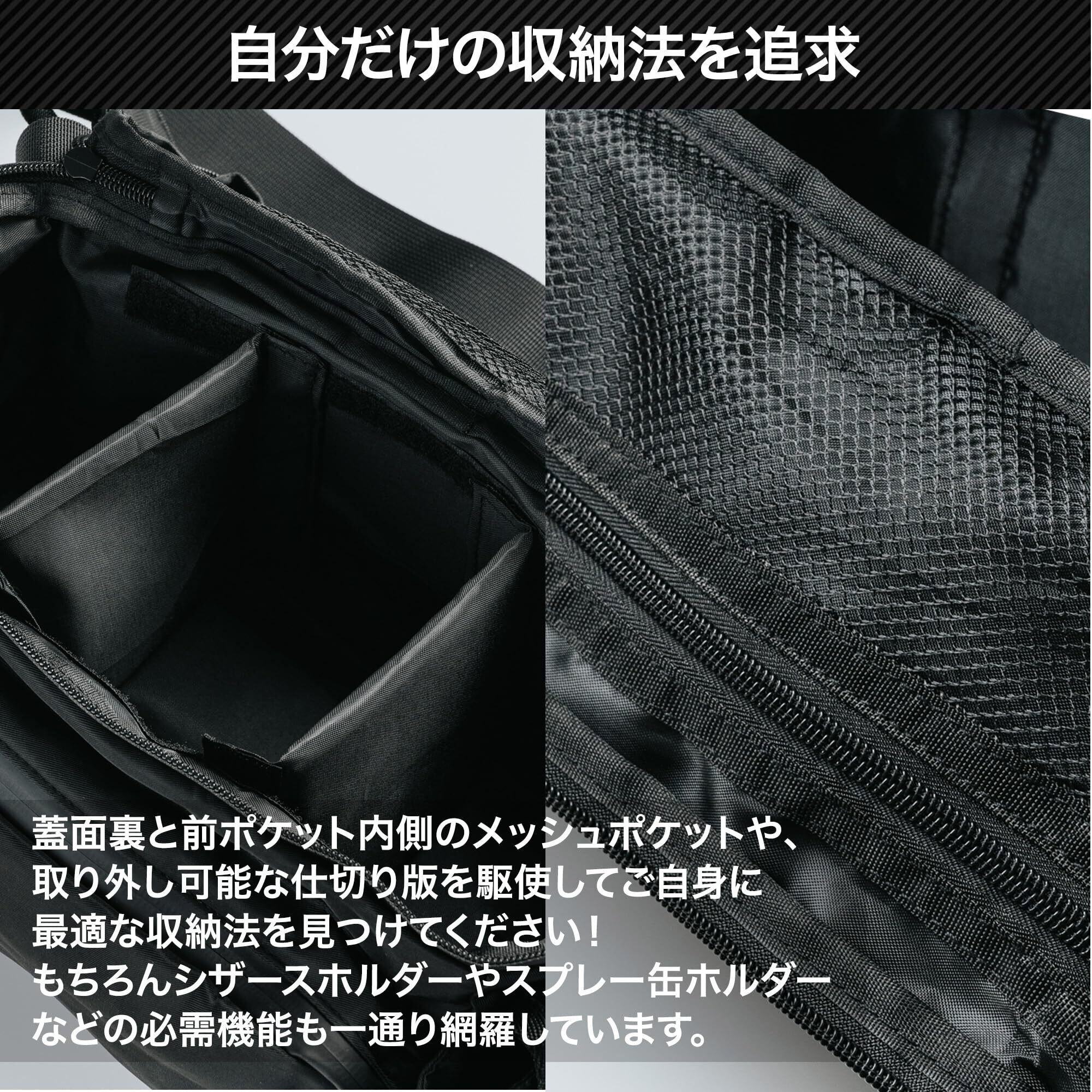 現役のアスレティックトレーナーと共同開発。雨対策にこだわり、生地の防水に加え、止水チャックを採用し、レインカバーも装備しています。各所に小物入れスペースも完備し、メインスペースは二つの仕切り位置を自由に変更、取外しができます。アスレティックトレーナー向けに利便性と機能性を追求した製品です。