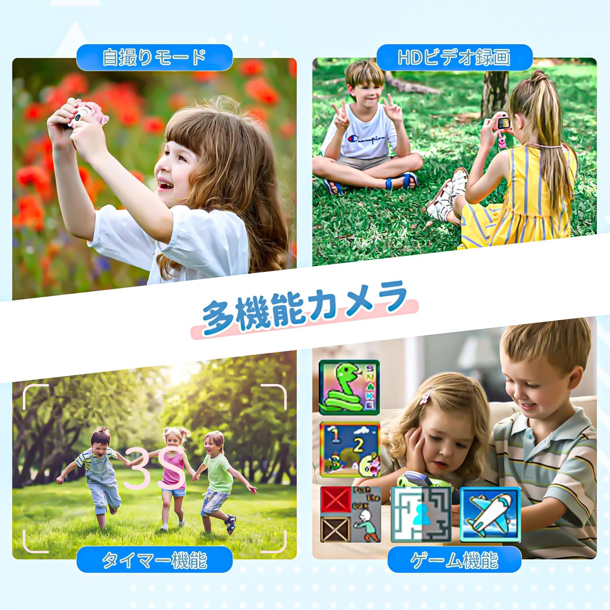 【高性能&多機能キッズカメラ】この子供 カメラは高画素なカメラを搭載し、鮮明で綺麗な写真と1080P HDのビデオを撮ることができます。高画質フロントカメラとバックカメラは自由に切り替えることができ、自撮りカメラとしてタイマー機能で簡単に自撮りもできます。子供 カメラの2.0インチスクリーンは、お子様の目を保護しながら、撮影内容をはっきりと映し出します。このキッズカメラには4倍ズーム機能も搭載されており、遠くまで鮮明に撮影し、美しい瞬間を記録できます。トイカメラには最大6時間のビデオ録画機能が搭載されており、動く瞬間を逃さず撮影できます。注:ビデオ録画機能を使用するには、キッズカメラにメモリーカードを挿入する必要があります(当社製品には64GBのメモリーカードが付属されております)。