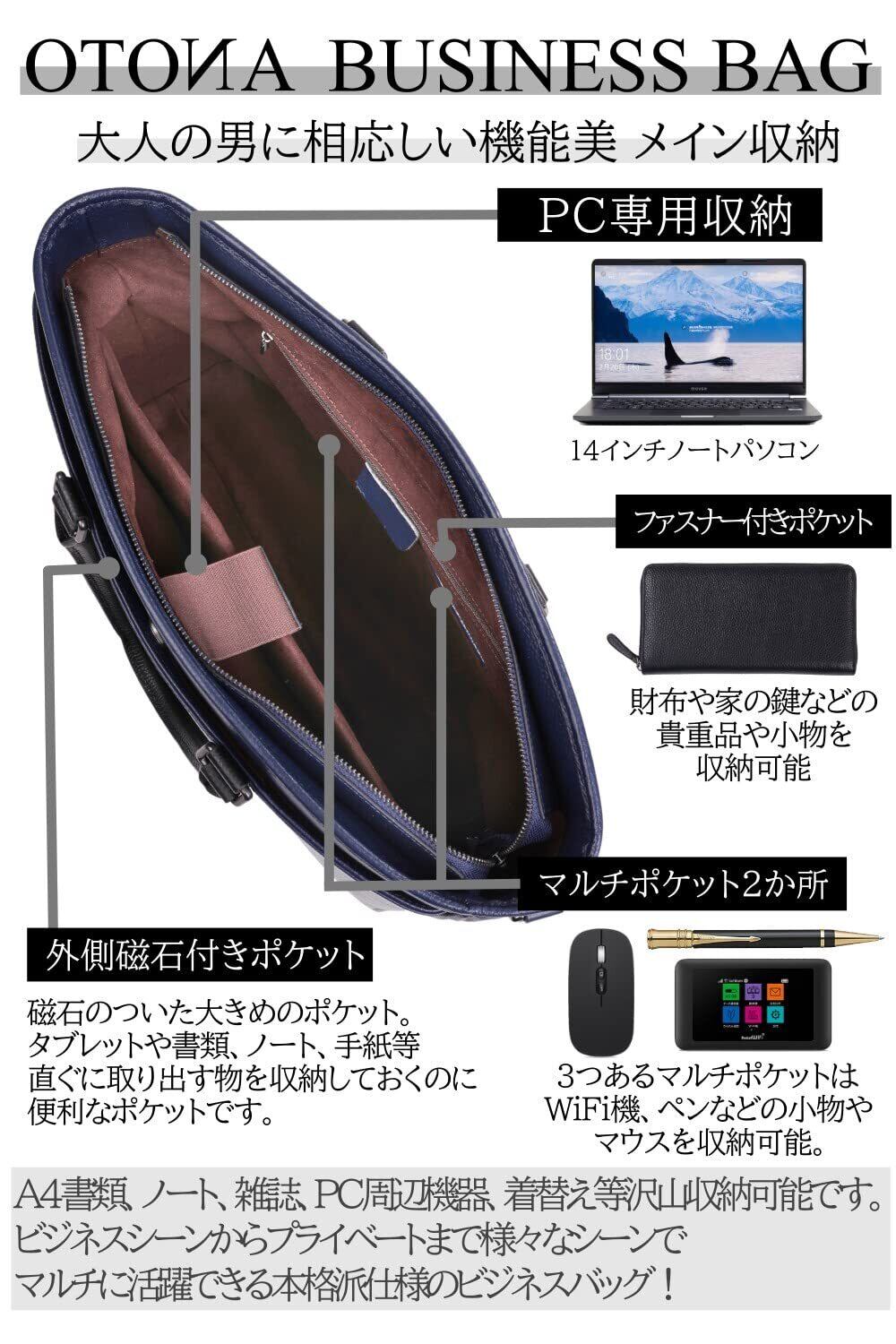 【素材】: 本革 【仕様】: ビジネスバッグ( ショルダーバッグ ) 【対象】 : メンズ 【サイズ】縦幅30㎝×横幅42㎝×マチ12cm×持ち手23㎝ 【重さ】1.4kg 【熟練本革職人が贈る 至高の大人鞄(ショルダーバッグ)】高級シボ牛本革を纏った「BAGPACK」シリーズ。大人の風格漂う逸品に仕上がりました。 【厳選した天然皮革を使用】 本商品は1層目の最表面の牛皮を使用しており、本革特有の不規則で美しい「シボ」(凹凸模様)を愉しんで頂ける商品となっております。 【こだわり収納】 内装には、大中小の小物ポケットとファスナー付きポケットを採用。クッションを施したパソコン専用ポケット付き。広々としたメインポケットは様々な物を収納できます。