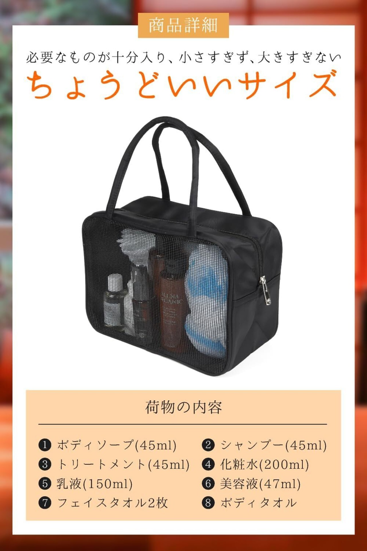 【ちょうどいいサイズ】コンパクトで、持ち運びに最適サイズの温泉バッグ(スパバッグ)です。シャンプーセット、スキンケア用品、アメニティなどを「ひとまとめ」にして持ち運びできます。