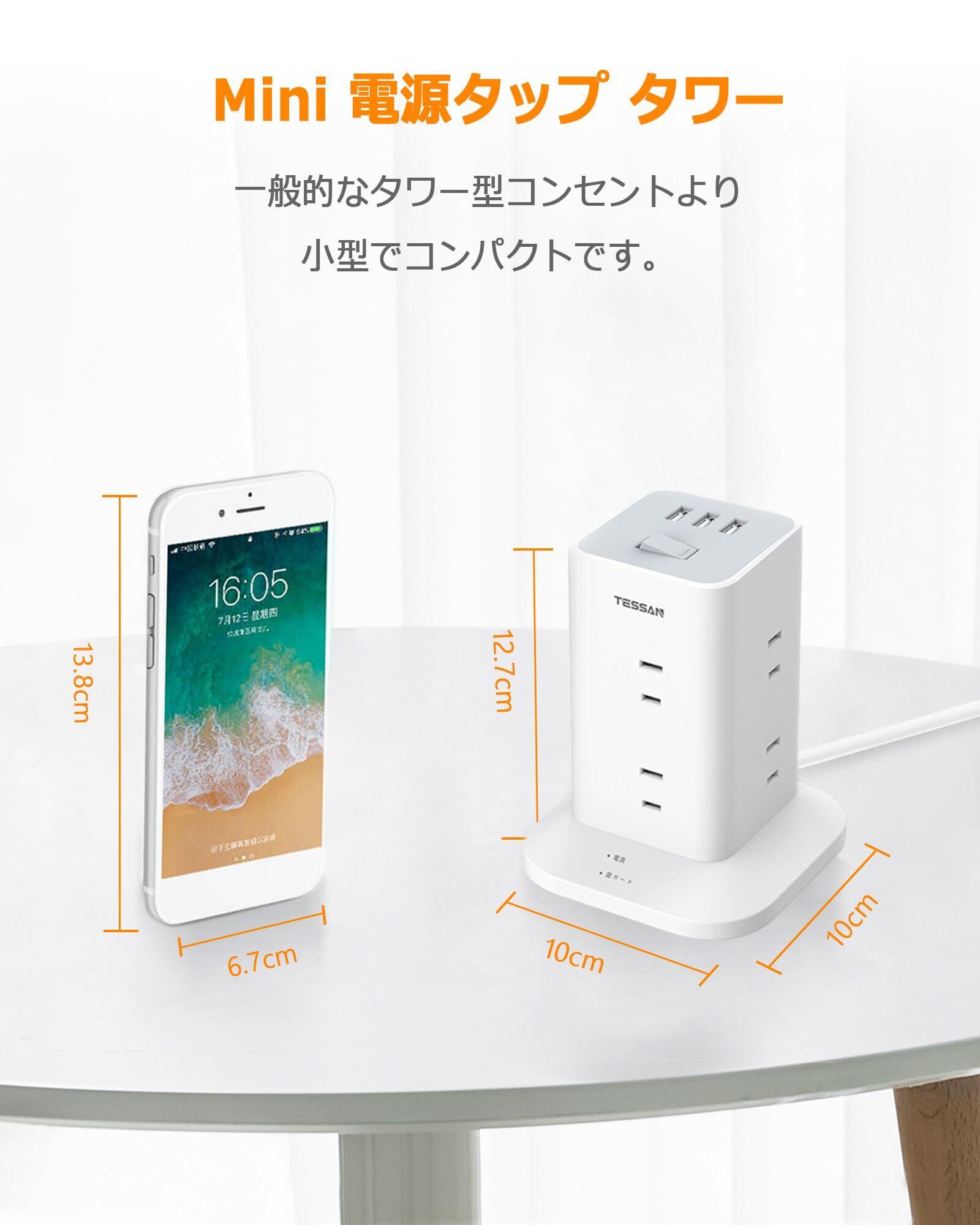 【タワー電源タップmini型】この電源タップは日本のために研究し、設計されていて、一般的なタワー型コンセントより小型でコンパクトです(本体サイズ:僅か10x10x12.7cm)。在宅勤務、オフィス、会議室、学校、寮、パーティーなど様々な使用場所で活用できます。