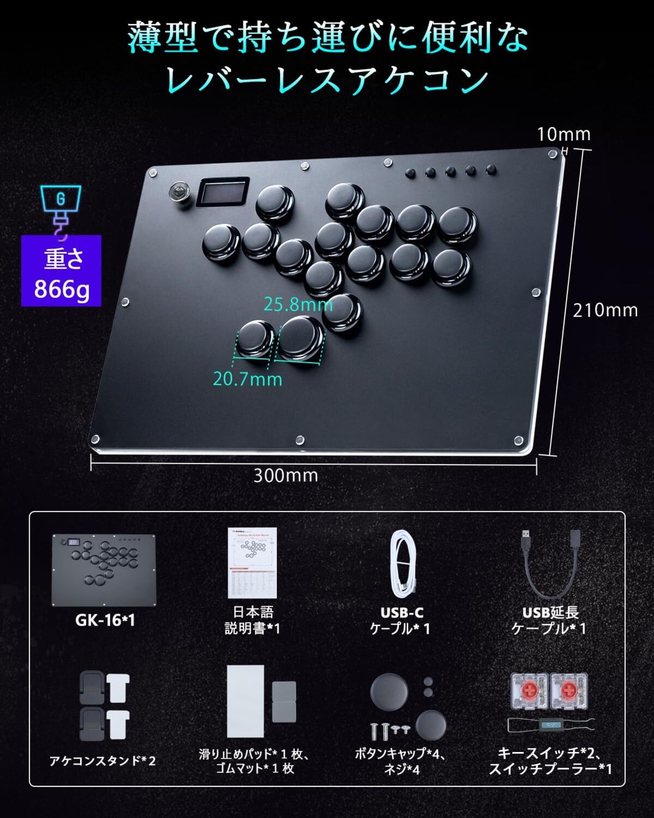 【GK-16黒のパッケージ内容】製品サイズ 300*210*10mm、重さ866g。ボタンサイズ 大きめ25.8mm 小さめ20.7mm ①USB-C ケーブル×1、②USB延長コード×1、③スタンド*2、④滑り止めパッド×1枚、⑤ゴムマット×1枚、⑥ボタンキャップ*2、⑦ゴムキャップ*1、⑧ネジ*2、⑨キースイッチ*2