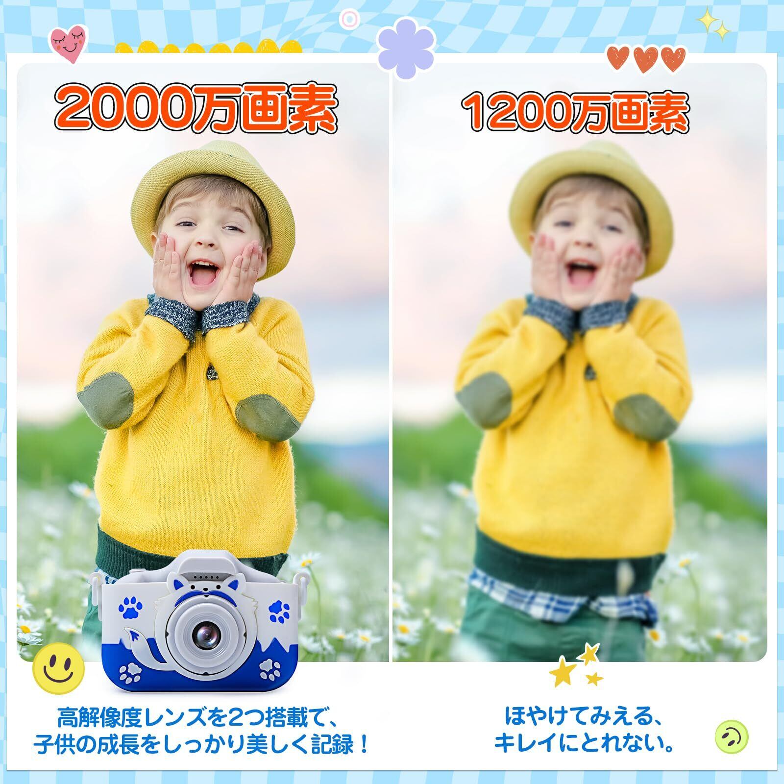 【2000万画素の高解像度キッズカメラ】これらのカメラは、子供たちが簡単に使えるように設計されており、2000万高品質な写真、1080pの高画質ビデオを撮影することができます。また、フロントとリアに搭載された二つのカメラで、自撮りも可能です。さらに、OTG変換を利用すれば、SNSなどの社交プラットフォームに簡単にアップロードすることもできます。子供たちの撮影や社交ニーズに見事に対応する、優れたカメラです。