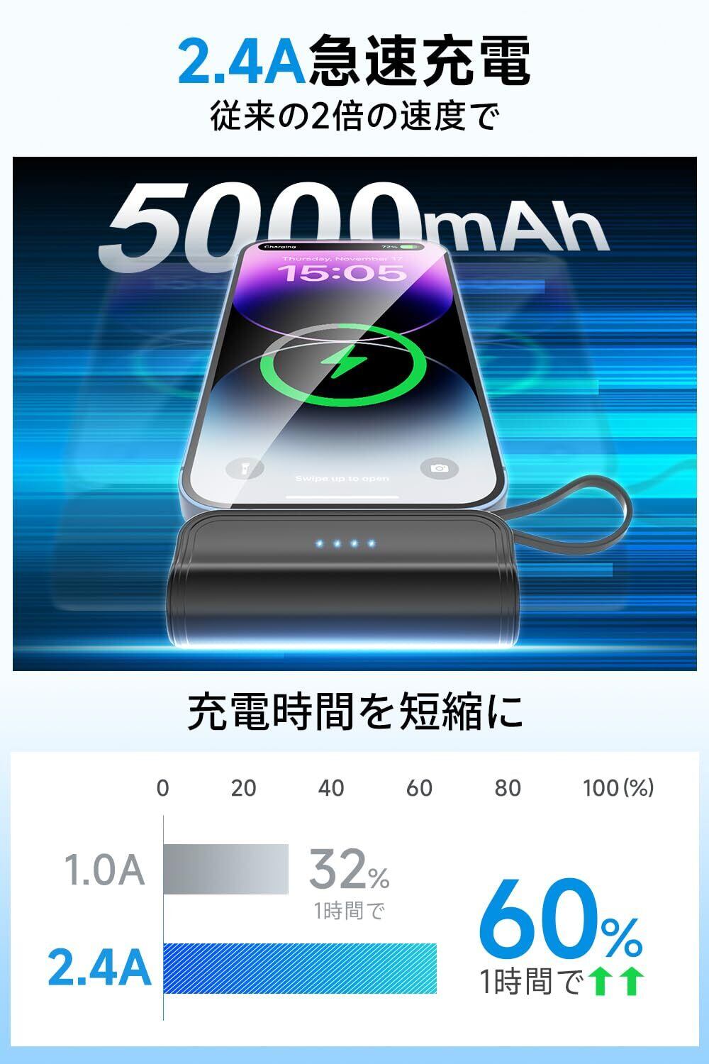 【2024新設計 超軽量・約98g】 モバイルバッテリー 小型 大容量 5000mAh MFi正規認証 (Lightningコネクター & タイプCコネクター内蔵) スマホ充電器 急速充電 携帯充電器 コンパクト 持ち運び便利 スタンド搭載 機内持ち込み可能 旅行/出張/アウトドア/キャンプ/停電対策/防災 iPad/iPhone/Android各種スマホ対応 (ホワイト)