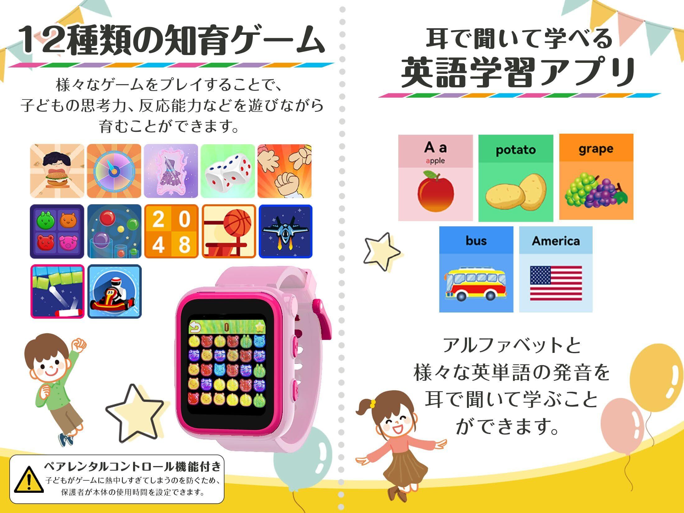 ■【当社オリジナル】他製品でよく使われている違和感のある日本語を日本企画・当社監修で修正ししております。また、オリジナルの言語モード(キッズモード)を搭載。 ■【キッズモード】小さなお子様など、より多くの子どもに楽しんでもらうために、『ひらがな・カタカナ』を中心に使用し、小さなお子さまが分かりやすい『表現』で表記しています。『キッズモード』は当店が日本で企画設計したオリジナル機能です。 ■【豊富な機能 全20アプリ】カメラ/動画/ボイスレコーダー/音楽/ゲーム/歩数計/デジタルキャラクター/タイムマスター/英語学習/音遊び/オリジナル文字盤作成/背景設定/アラーム/アルバム/LEDライト/電卓/カレンダー/設定 等の豊富な機能を搭載しております。