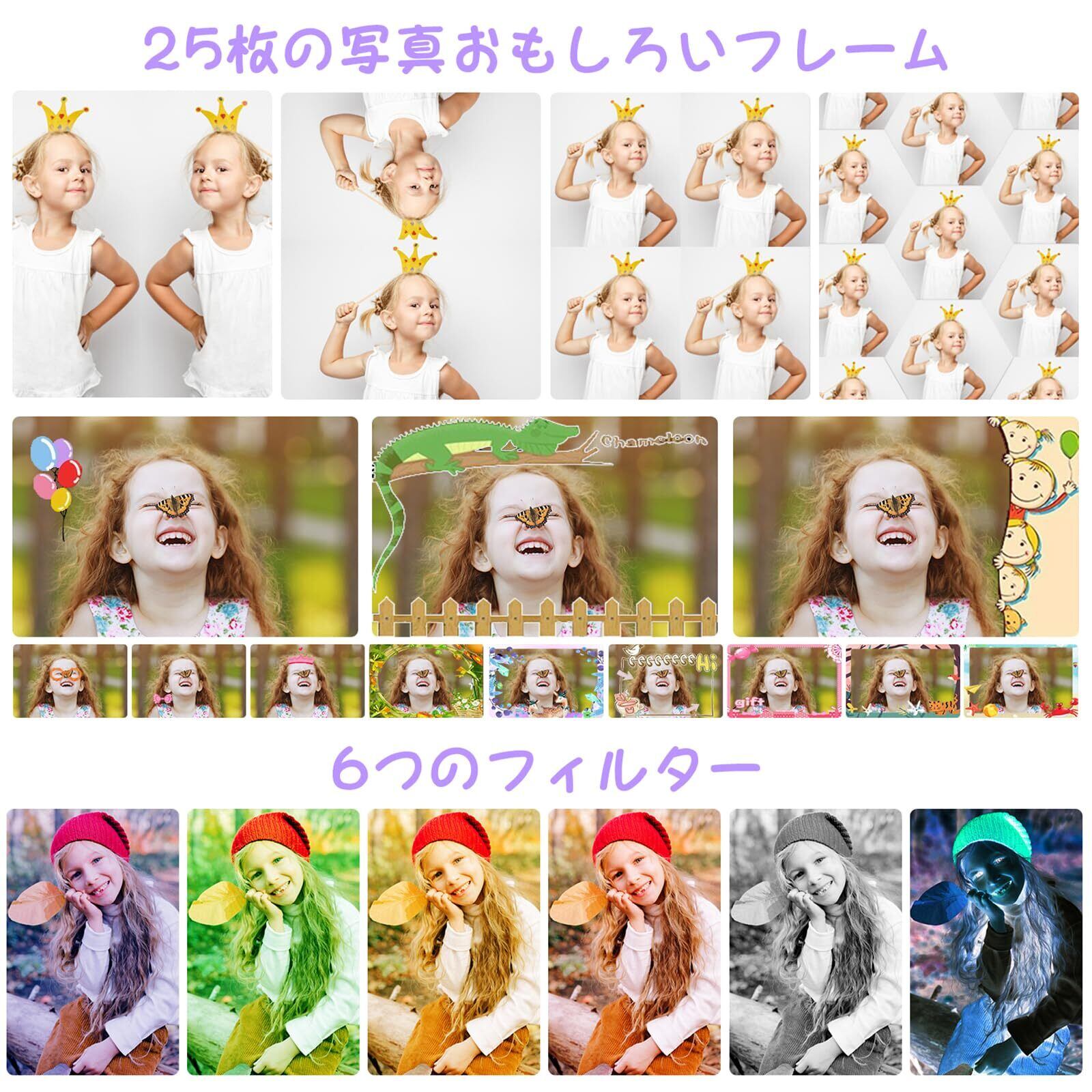 【31ファニーフレーム&5パズルゲーム】1000mA大容量バッテリーが2~4時間のバッテリー寿命をサポートします(市販の子供用カメラはすべて600mA)。5種類のパズルゲームが子供の思考を刺激し、思考力を鍛えます。画素数はデジタルカメラほどクリアではないものの、1080Pは子供のニーズに応えるのには十分です。31種類の面白いフォトフレームやフィルターが、子供の写真をより面白くします。