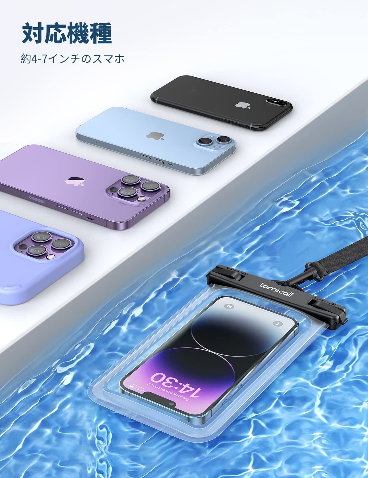 【IPX8認定防水・ナノ熱圧技術・一体型】注意この製品は水に浮くことができません。国際的な防水規格で最高レベルである、防水国際保護等級IPX8認定を取得したスマホ防水ケースです。水気のある場所だけでなく、水中での操作にも圧倒的な耐性があります。フィルムと一体型になっており、フィルムがズレることによる水の侵入を防ぎます。また、一般的なスマホ防水ケースでは、縁の部分が鋭利になっており皮膚を傷つけてしまうことがありますが、本製品はナノ熱圧技術により怪我を防止する設計を採用しました。愛用スマホだけではなくて使用者も守ります。