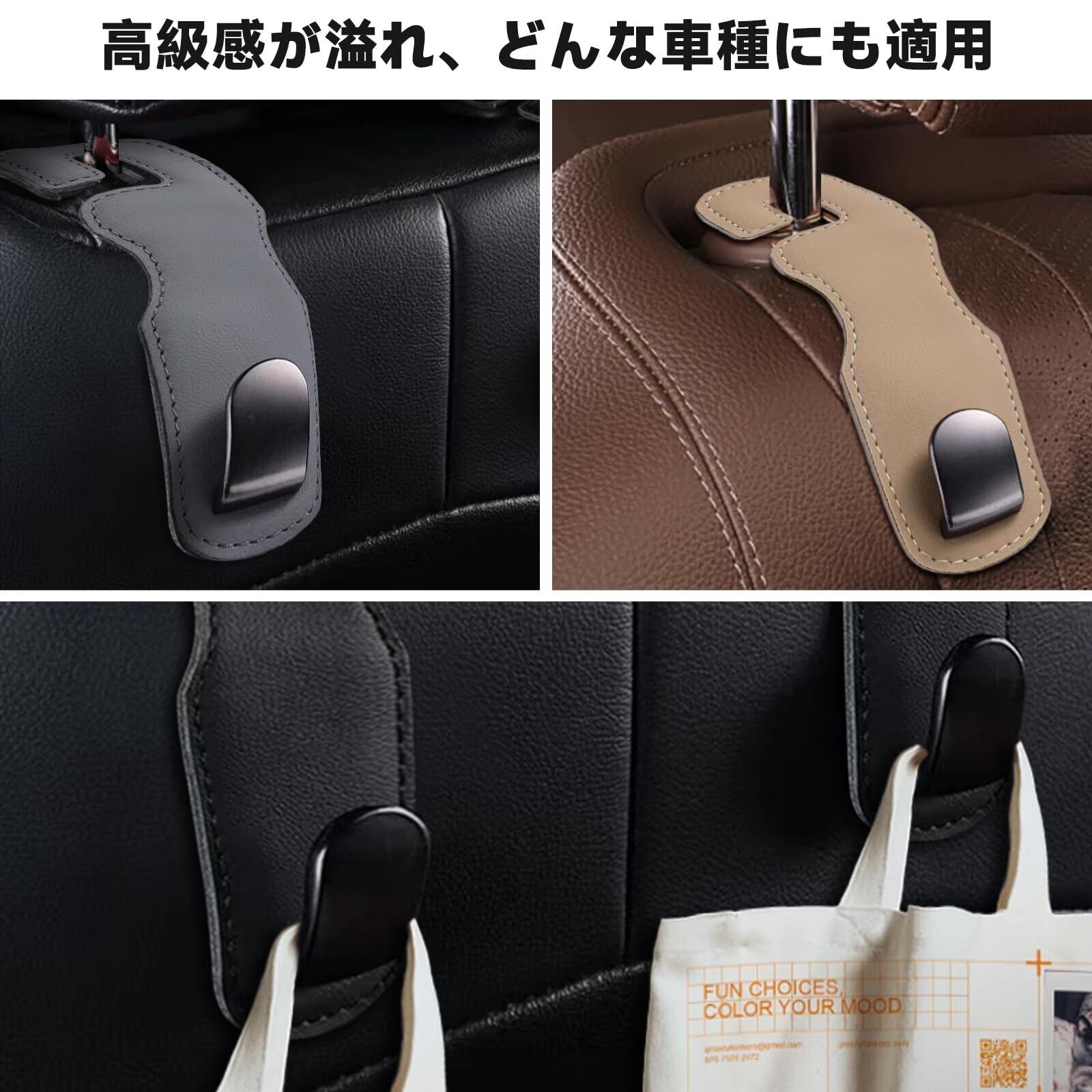 【商品仕様】フックサイズ:約17x7cm 厚さ:約2mm耐荷重:約30kg素材:レザー&高品質合金カラー:ブラック、グレー、カーキ車のカラーにより三色から選択できます。「の製品は1年の期間があります。万が一、初期不良や故障などが発生した場合、または製品に関する疑問がある場合は、どうぞお気軽にお問い合わせください。」